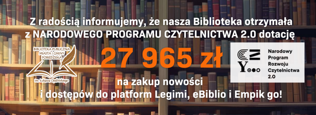 18 -19 listopada 2025 wszystkie nasze placówki będą zamknięte! Szkolimy się dla Was, za utrudnienia przepraszamy. POBIEDZISKA DWORCOWA 4 tel. 616698321 lub 512865202 ODDZIAŁ DLA DZIECI.tel. 786966444 pn. 10.00 - 16.00 wt. 11.00 - 19.00 śr. 8.00 - 16.00 cz. 11.00 - 19.00 pt. 10.00 - 16.00 sb. 9.00 - 13.00 (I i III miesiąca) POBIEDZISKA - LETNISKO tel. 618153445 w. 3 . wt. 8.00 - 17.00 śr. 8.00 - 15.00 cz. 8.00 - 14.30 pt. 10.00-14.30 BISKUPICE tel. 503104161 lub 618155005 pn. 9.00 - 16.00 wt. 11.00 - 18.00 śr. 8.00 - 15.00 cz. 11.00 - 18.00 pt. 9.00 - 15.00 sb. 8.00 - 12.00 (III miesiąca) POMARZANOWICE tel. 514205906 . wt. 8.00 - 17.00 śr. 8.00 - 14.00 cz. 8.00 - 17.00 pt. 11.00 - 14.00 Amor librorum nos unit - miłość do książek łączy ludzi 27 965 zł dotacji z NPRCz dla naszej biblioteki! Wernisaż wystawy “Błękitne ogrody” w Bibliostacji Noc Bibliotek w Filii Biskupice Noc Bibliotek w BIBLIOSTACJI Po Wielkopolsce z Biblioteką - GOŁUCHÓW NOC BIBLIOTEK NOWOŚCI KSIĄŻKOWE