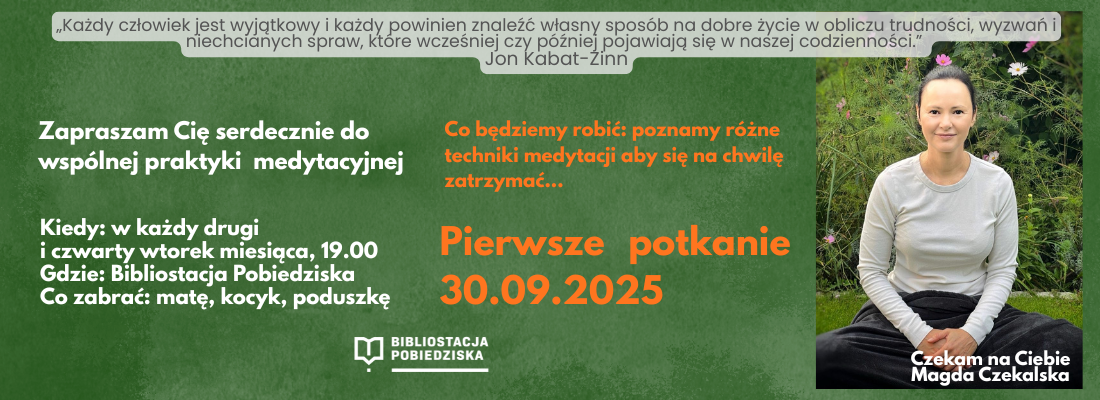 Zapraszam Cię serdecznie do wspólnej praktyki medytacyjnej podczas spotkań w każdy drugi i czwarty wtorek miesiąca w Bibliotece w Pobiedziskach. Co będziemy robić: poznamy różne techniki medytacji bądź pogłębimy dotychczasową praktykę.…