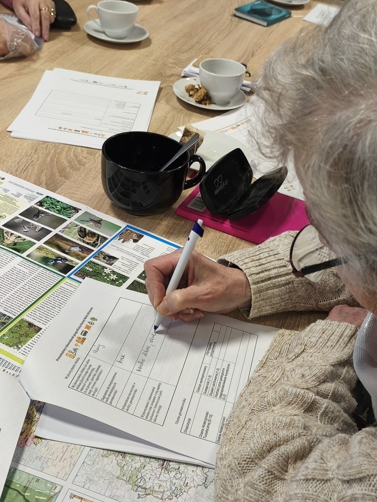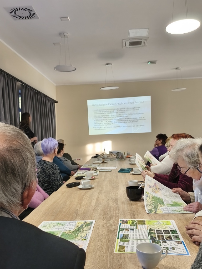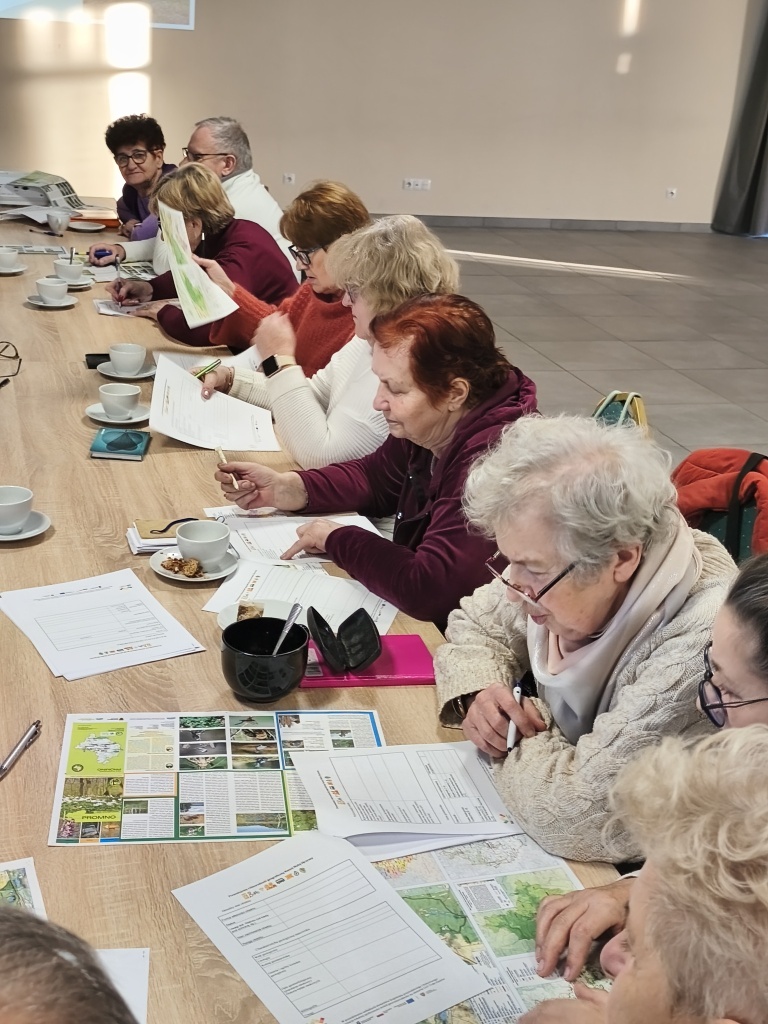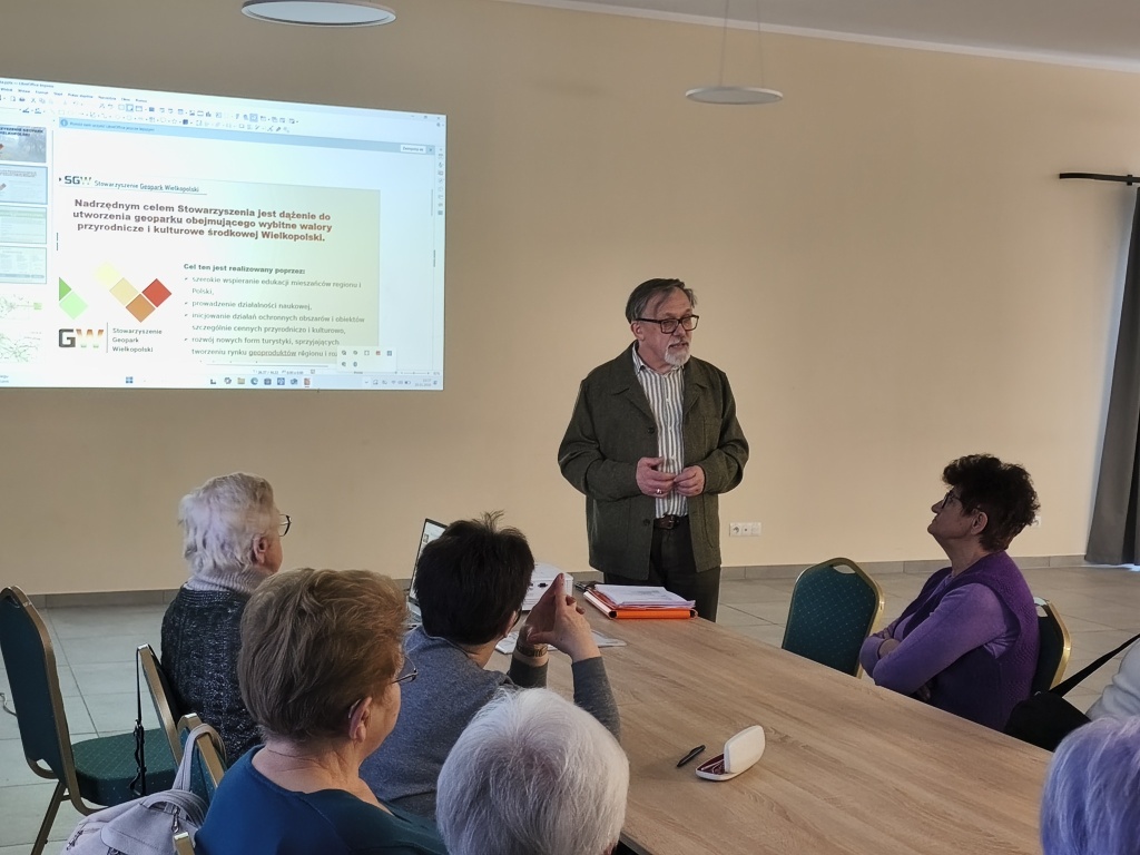 Podczas spotkania dr Alicja Najwer zabrała uczestników w podróż po najciekawszych geostanowiskach świata, a następnie zaprosiła do wspólnego działania. Seniorzy, dzieląc się swoją wiedzą i doświadczeniem, wypełniali ankiety dotyczące potencjalnych obiektów geoturystycznych na terenie Parku Krajobrazowego Promno oraz Doliny Cybiny.