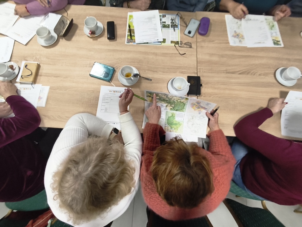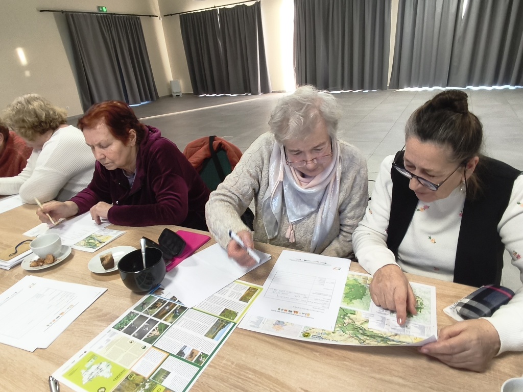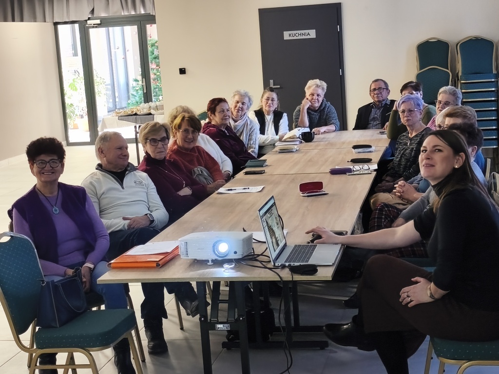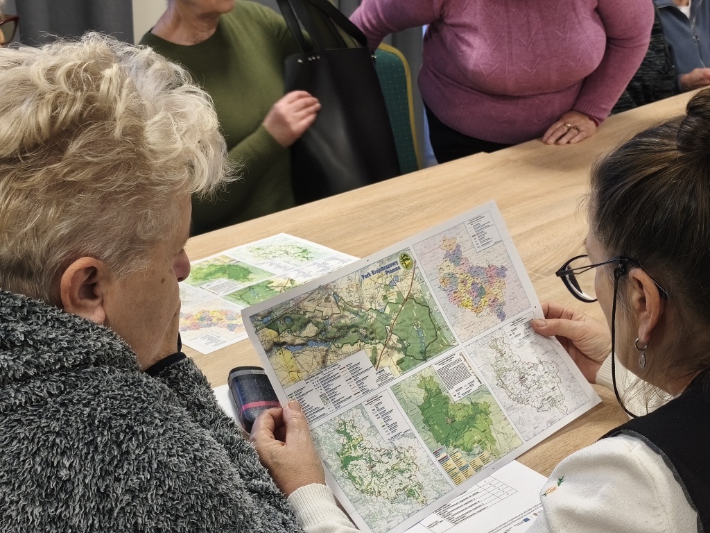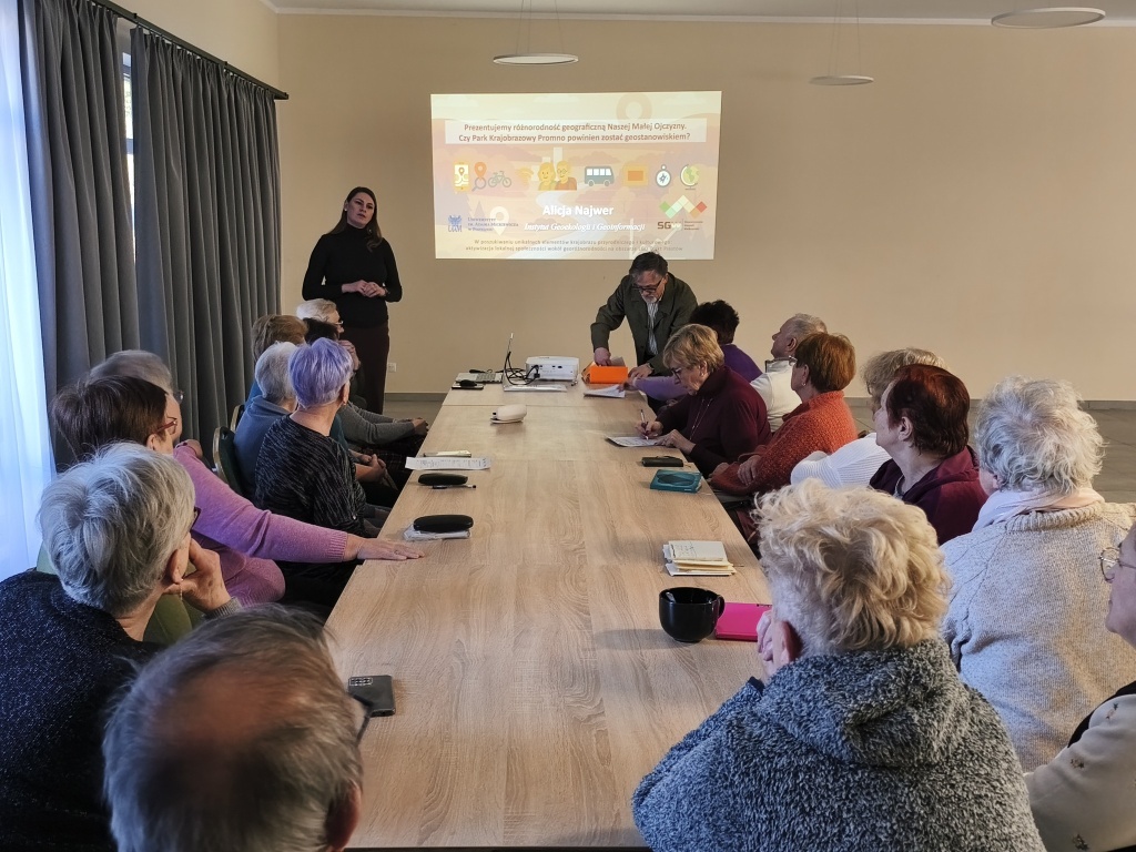 Podczas spotkania dr Alicja Najwer zabrała uczestników w podróż po najciekawszych geostanowiskach świata, a następnie zaprosiła do wspólnego działania. Seniorzy, dzieląc się swoją wiedzą i doświadczeniem, wypełniali ankiety dotyczące potencjalnych obiektów geoturystycznych na terenie Parku Krajobrazowego Promno oraz Doliny Cybiny.
